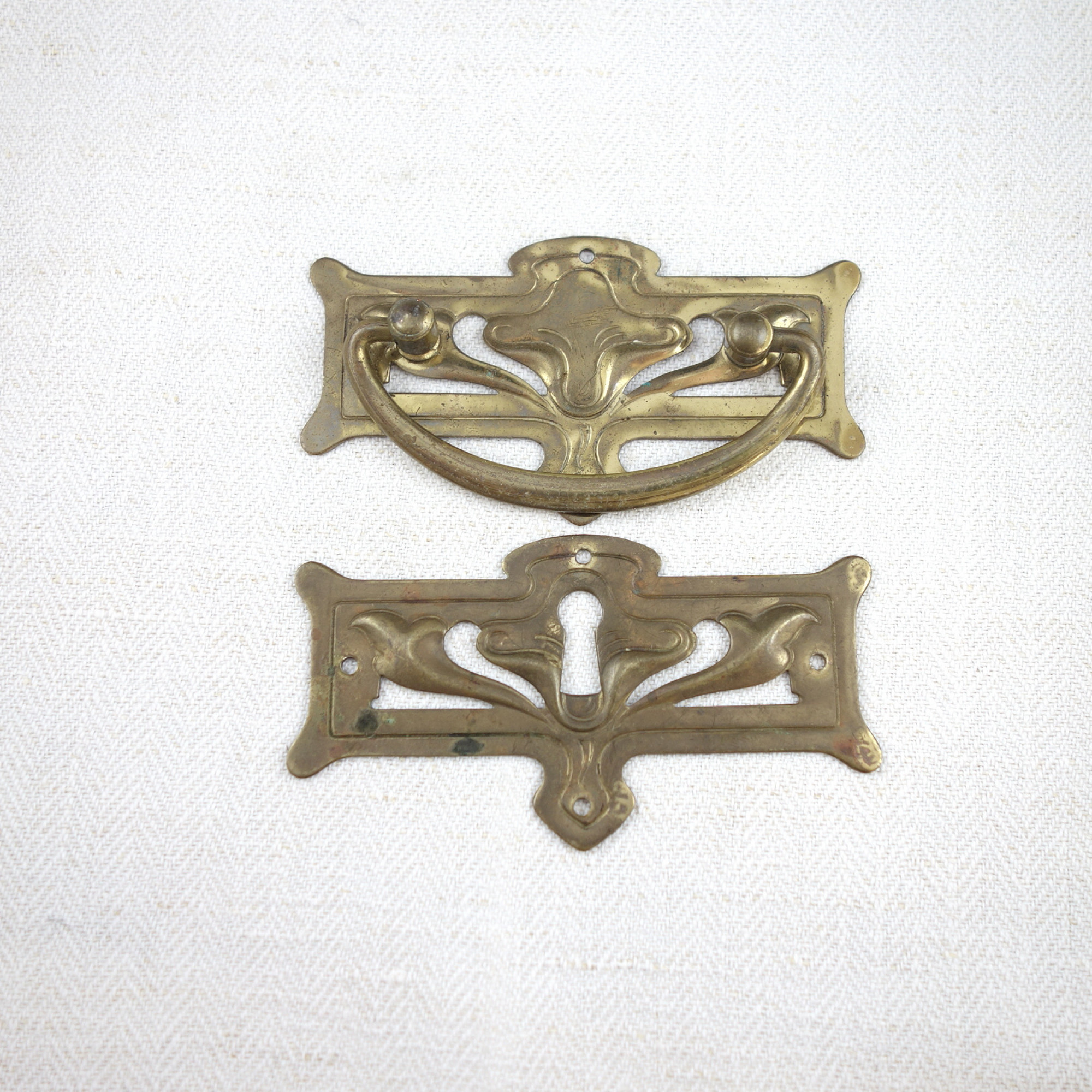Ca 9x5 cm. Pris avser nedre beslag. Med handtag, se m1135. Går nog att putsa bättre.